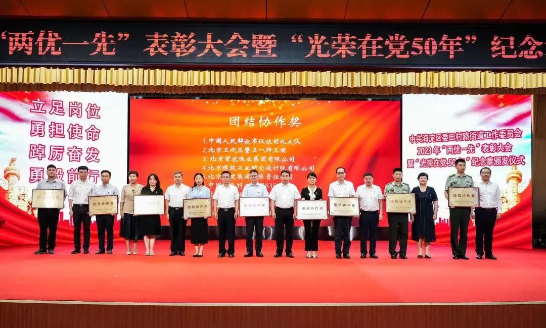 砥礪初心擔(dān)使命,踔厲奮發(fā)勇作為。在中國(guó)共產(chǎn)黨成立102周年之際,6月28日上午,田村路街道隆重舉行“迎七一 樹典型 學(xué)先進(jìn)”2023年“兩優(yōu)一先”表彰大會(huì)暨“光榮在黨50年”紀(jì)念章頒發(fā)儀式。海淀區(qū)政協(xié)副主席、田村路地區(qū)黨建工作協(xié)調(diào)委員會(huì)主任李偉,區(qū)委組織部副部長(zhǎng)孔磊,區(qū)委宣傳部副部長(zhǎng)刁偉梅,田村路街道及各基層黨組織、地區(qū)單位代表等參加活動(dòng)。會(huì)上,北京龍徽國(guó)際酒文化創(chuàng)意產(chǎn)業(yè)有限公司作為地區(qū)黨建工作協(xié)調(diào)委員會(huì)成員單位代表,受邀上臺(tái)榮獲了團(tuán)結(jié)協(xié)作獎(jiǎng)獎(jiǎng)牌。