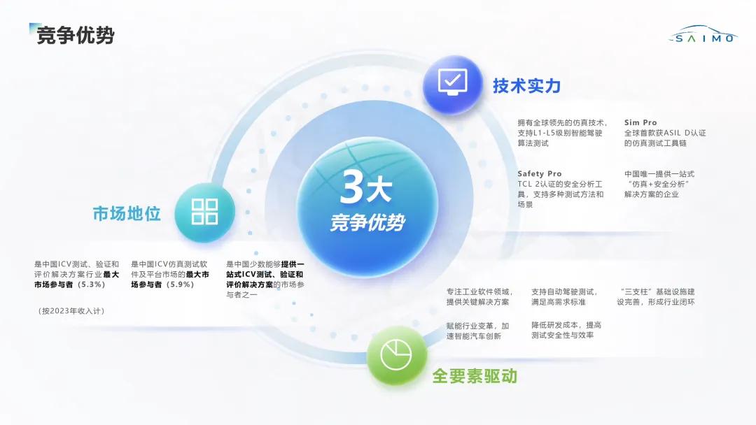 據(jù)介紹,智能網(wǎng)聯(lián)汽車(ICV)仿真測試領域具有廣闊的市場前景。根據(jù)弗若斯特沙利文數(shù)據(jù),中國ICV行業(yè)市場規(guī)模預計從2023年的1653億元增長至2030年的6596 億元,年均復合增長率約20.1%;其中ICV 測試、驗證和評價解決方案行業(yè)市場規(guī)模將以 33.6%的年均復合增長率增長至279億元。賽目科技致力于解決行業(yè)關鍵痛點,并持續(xù)創(chuàng)新,為行業(yè)提供全面的工具鏈解決方案。工具鏈以Sim Pro(仿真平臺)和Safety Pro(綜合安全分析工具)為核心,兩款產(chǎn)品已通過ISO 26262標準的功能安全認證,成為賽目科技技術壁壘和利潤增長點的重要組成部分。憑借技術優(yōu)勢和市場前瞻性,賽目科技正成為智能駕駛從概念邁向規(guī)模化落地的“隱形引擎”,也是這一高速增長中的最大受益者。